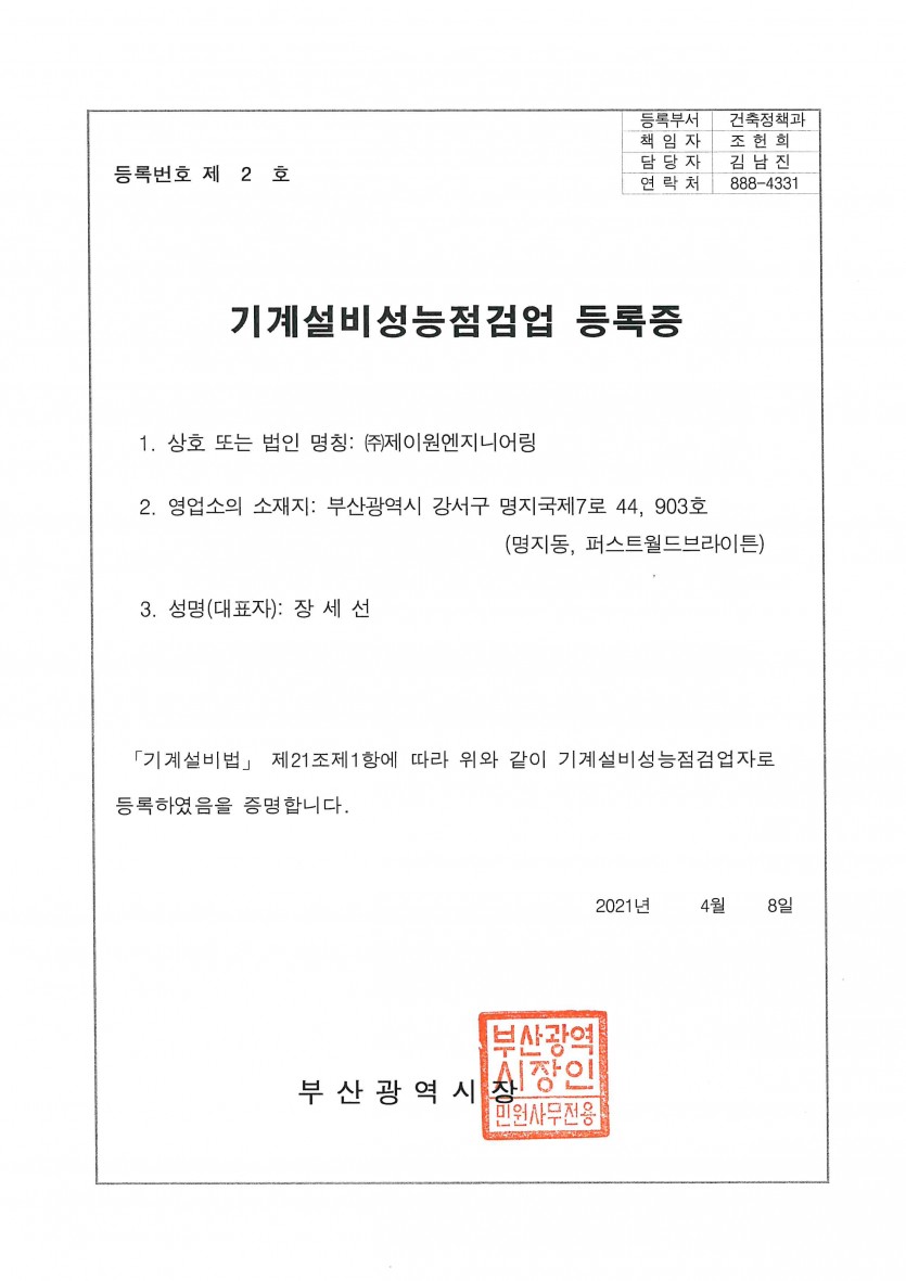 (주)제이원엔지니어링 기계설비 성능점검업 등록증 발급